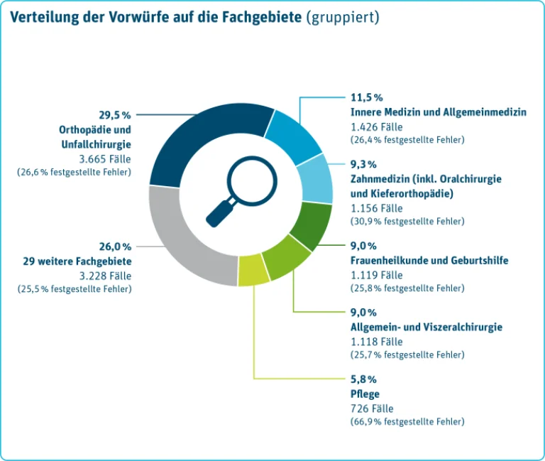 In jedem 4. Fall (3.160 Fälle) wurde in den Gutachten ein Behandlungsfehler mit Schaden bestätigt, durch die Patientinnen und Patienten vorübergehend oder dauerhaft geschädigt sind. In jedem 5. Fall (2.679 Fälle) war der Fehler auch kausal für den erlittenen Schaden, welches Voraussetzung für die Geltendmachung von Schadensersatzansprüchen ist.